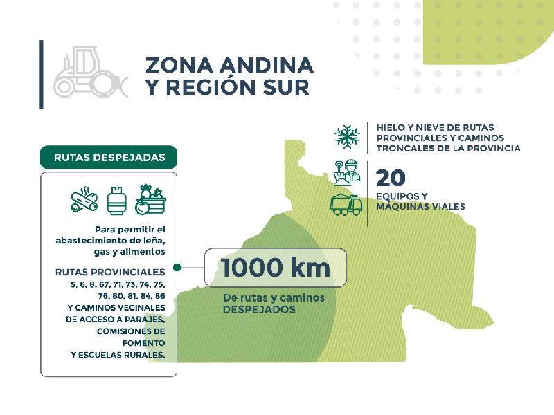 Asimismo, si se tienen en cuenta los trabajos de despeje enmarcados en el Operativo Nieve que se desarrollan rutinariamente en San Carlos de Bariloche y alrededores, la cantidad de kilómetros despejados por Vialidad Rionegrina supera los 1000.